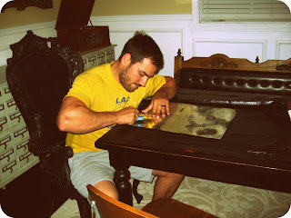 The end result- 9 hours {on and off} of work, 4 small holes, fabric that we loved at the store, but do not like on the mirror, especially in our living room, and a new present for Katie {our little sister}!