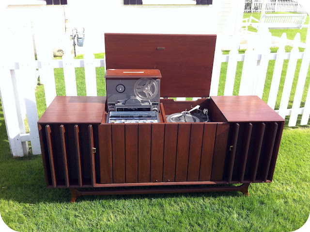 So far with the research i’ve done tonight, I think it was from anywhere 1960-1965. The best part {well, one of the best parts} is that ours is in PERFECT, no joke, perfect, condition. No scratches, dents, something not working, nothing-its all perfect. We couldn’t believe that it worked at all, much less sounded so good. It has a record player, AM-FM radio, and a reel-to-reel recorder. Oh ya, and the reel to reel literally pops up out of the player. You press down, and it pops up. I swear I did it about 20 times when we got it, I couldn’t get over how cool that was!
