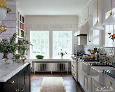 Loving these white kitchens. Farmhouse {apron} sinks, white subway tile, dark wood floors, beautiful faucets….swoooonnn!