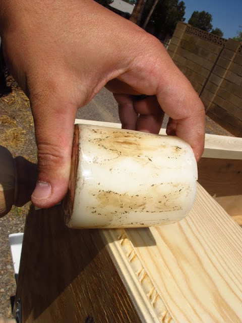 • Rub wax on the cabinet on areas that you want to see chipping or peeling paint. We apply wax to most of the edges, because that will be an area that we want to look more worn. This will help greatly with the distressing later. To apply the wax we just use a cheap old candle. Any wax will do {it has been in the garage for a while, hence the crazy dirt stains}.
