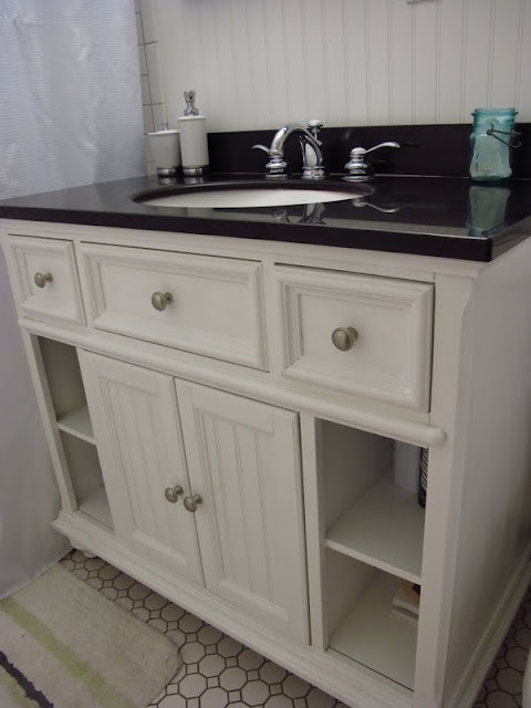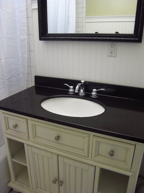 I hope you can see some of the difference in these photos, but if not- let me just tell you! Those two coats of paint made our vanity totally fit in now. It actually looks like it belongs. Its crisp and fresh. I love it! I mainly used a small foam roller {from Home Depot} but had to use a brush in the awkward areas.