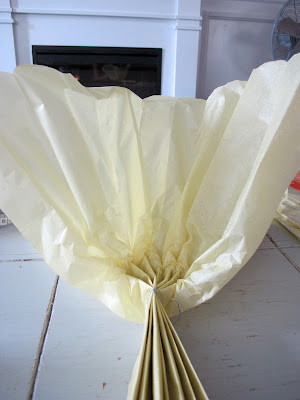 •  Ok, really you need to start by folding your tissue paper like an accordion, with each fold being about 1 1/2in. wide: