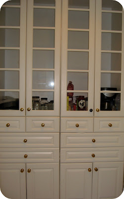 The one area though that was a serious problem was the empty space across from the dishwasher {Sorry I don’t have a before shot of the area}. We knew we needed more cabinets and storage area, so an extra set of cabinets would be perfect. The problem though was-how do you add cabinets that you want to blend in with the rest, when you can’t get the same exact ones? CRAIGSLIST!! We found this bad boy on Craigslist, and knew with a few adjustments, it would seem as though it was always part of the kitchen.There originally were 2 sets of cabinets. The hardest thing about the install was dealing with the height of the cabinets. Since it was a tight fit to begin with the fact that the cabinets were only 3″ shorter than our ceiling made for it challenging just to fit the cabinets in the space, since we had to lean them in. Once they were in their spot, just a few screws into eachother and into the wall and they were all set. Here is a shot of the cabinets after J installed them.