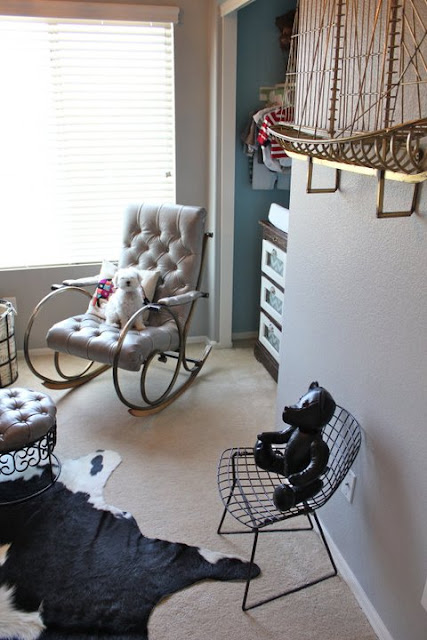 The rocker they have is possibly my most favorite part of the room.It is a Woodard and Sons rocker that they got from one of their friends who also deals in the world of vintage furniture. They had it recovered in a beautiful soft grey leather hide. Luckily the hide was large enough to also cover the ottoman. The ottoman completely looks like its part of the set, but its not! They got it for $10 at an estate sale! Who gets that lucky?!
