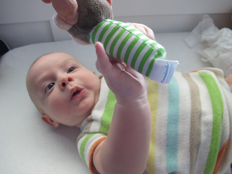 - Along with getting better at grabbing things, he has also mastered the art of grabbing things and putting them straight in to his mouth…always! Anything that I hand him goes straight to his mouth, yikes.
