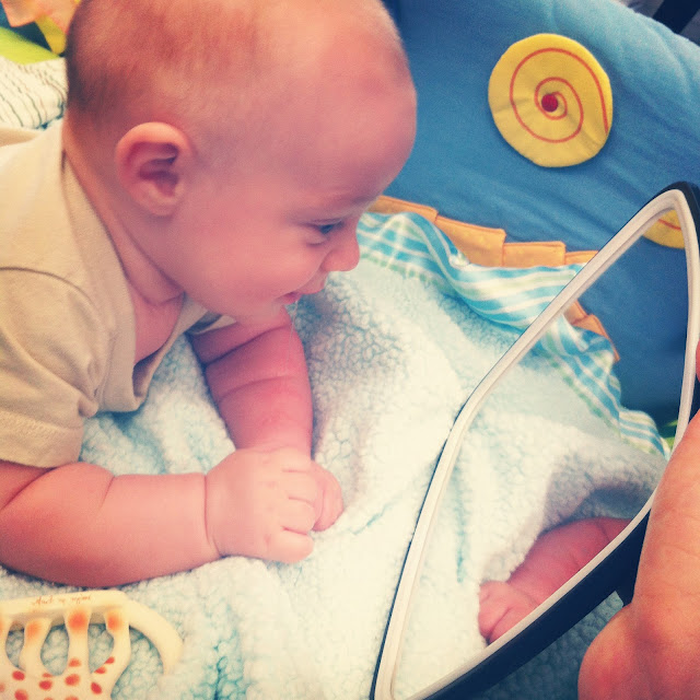 - He has gotten so good at tummy time this month. He lifts his head so high, propped up on his forearms. He actually enjoys it now too, which is so different from last month. His favorite thing to do while practicing, staring at himself in the mirror..what a vain little man;)
