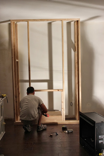 Its amazing what can happen in a short amount of time. J had a half day on Monday because of the holiday, so when we got home he went straight to work on building out the wall for our living room. This is where the gas fireplace is going, and there will be cabinets on the sides. Here are a few progression shots: