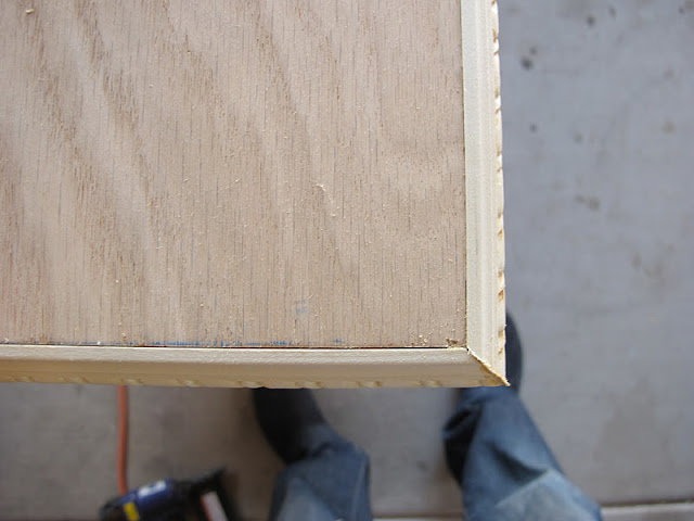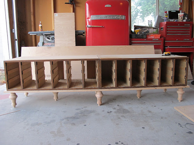 Once the sections were attached to each other and the base, it was time to attach the back, sides, and finally the top. All pieces were attached by screws from the inside of the cabinet.