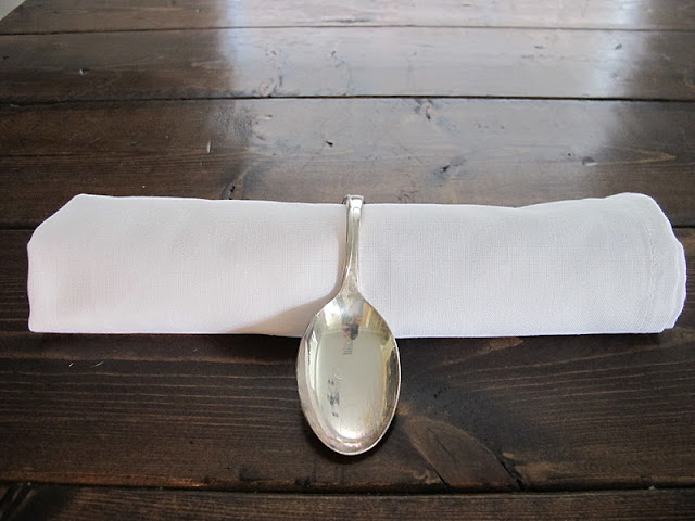 I’ve never seen silverware used as napkin rings, but someone in my family did a similar thing and used them as placecard holders.