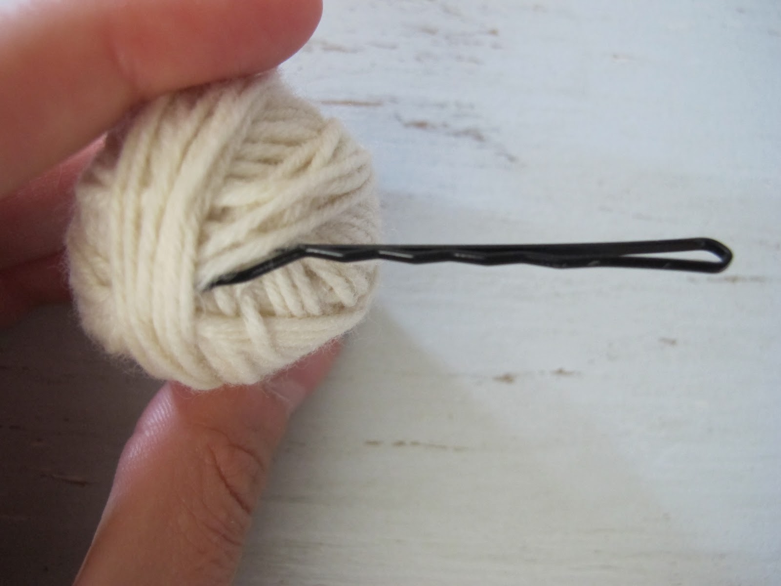 - Once the dryer ball is ‘lime’ sized, cut your wool and tuck the end into the center. You can use a crochet hook if you have one, or you can be super classy like me and simply use a bobbypin: