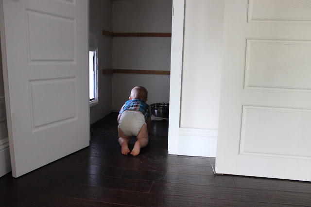 Today we are getting some of the flooring replaced from the leak, then the new kitchen cabinets will go in. Still no word on finding flooring quite yet, but we are keeping our fingers {and toes} crossed. In the mean time, I will be busy making a million and one ice cream cone garlands, all the while chasing after this crazy kid…whose only two goals in life right now are to eat the dog food or climb the stairs!