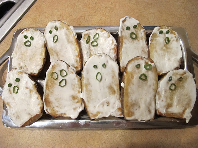 Our cooking club is still going strong, over a year now, and I love it. Because it has been going for a year, we have been needing to get creative with themes so that we are not making the same things over and over. Last nights theme was Halloween. At first, I was concerned thinking ‘how on earth can we make a whole meal based on Halloween?!’. Well we did! I made potato skin ghosts, and here was the whole spread: