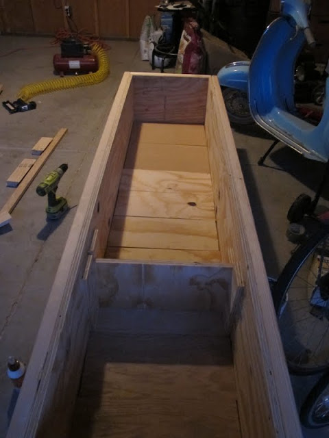 - Then we lined the planter using some heavy duty plastic. This was pretty simple just fold the edges and staple the plastic to the top and inside edges of planter. We also drilled holes in the bottom and stapled the plastic around the holes. This will allow for drainage.