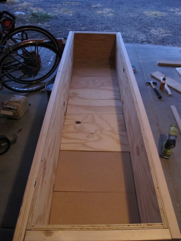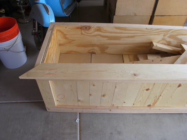 - Then we lined the planter using some heavy duty plastic. This was pretty simple just fold the edges and staple the plastic to the top and inside edges of planter. We also drilled holes in the bottom and stapled the plastic around the holes. This will allow for drainage.