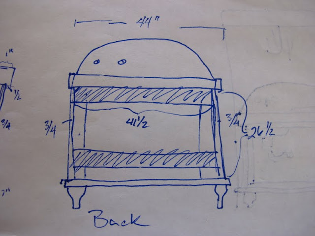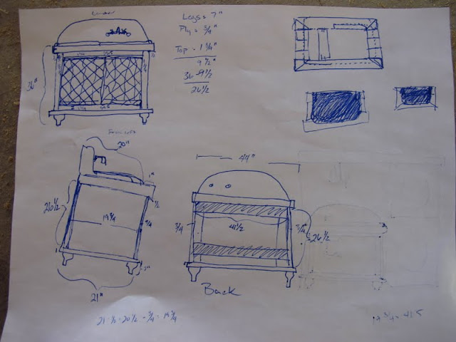 We wanted to make our laundry room into a room that matched our style and house and not just a storage or task room, cuz those are just lame and usually smell like bleach. The whole room is essentially designed around our antique sink {here} that we purchased from NYC on Ebay. This sink is so rad that I would use it as a bath tub if I was bite size, or a bed if it was filled with pillows. But it needed a base, and more importantly a base that was a very specific size. Our washer and dryer (which we got a great deal on {here}) are going to be stacked to the left of the sink. The room is just under 81″ wide, and the washer is 36″ wide. That leaves us with 45″ in width for the cabinet. The sink is 42″ wide so the cabinet needs to be more than 42″ but less than 45″ wide, so this definitely made it hard to find a cabinet that would work. Since the sink is old school we wanted to find an old school dresser or buffet to use, but after weeks of scouring Clist with no luck {some we loved but the measurements weren’t right, and then some of the others had prices that weren’t right} J decided he would just make one on his 3 day weekend {Memorial Day}. So he drew up plans similar to the plans he drew up for the card catalog {here}. We love the spindly legs and the rope-ish trim, so he planned on using those elements on this cabinet.