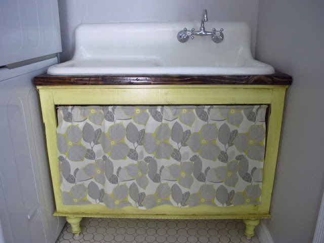 And there you have it, a custom cabinet for a custom sink for a custom room in a custom home. Now we obviously are not going to leave this like so. Here is the tutorial on how we painted it to make this new cabinet look like it has been married to the sink for the past 40 years {which adds a whole new pun to the drop in sink element;)}. Just to give you a tease here is a sneak peak of the color we chose.