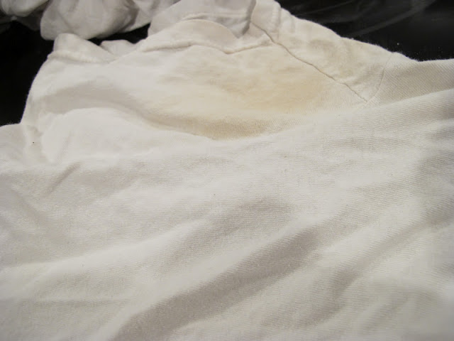 I used 1/4 cup dawn dish soap and 1/2 cup hydrogen peroxide for the mixture to do about 15 shirts. Also, I knew that I was working with some serious stains so I automatically went ahead and scrubbed with a little baking soda as well. Here is what grossness I started with {you can also clearly see it in the above photo}: