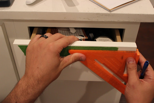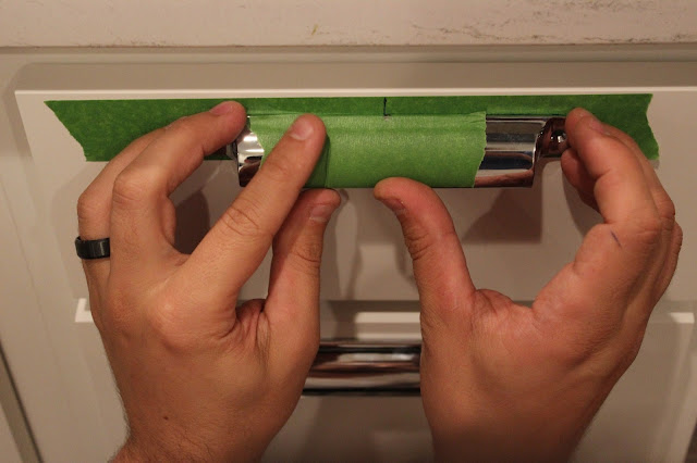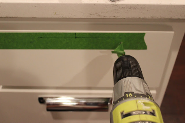 - Start off by taking pictures in terrible lighting. Wait, thats not step one, just is step one for us since we did this at 9pm:) Really though, start with your clean bare cabinet and begin by placing painters tape on the front of the drawer, measure out to find the middle and mark it with a pen.
