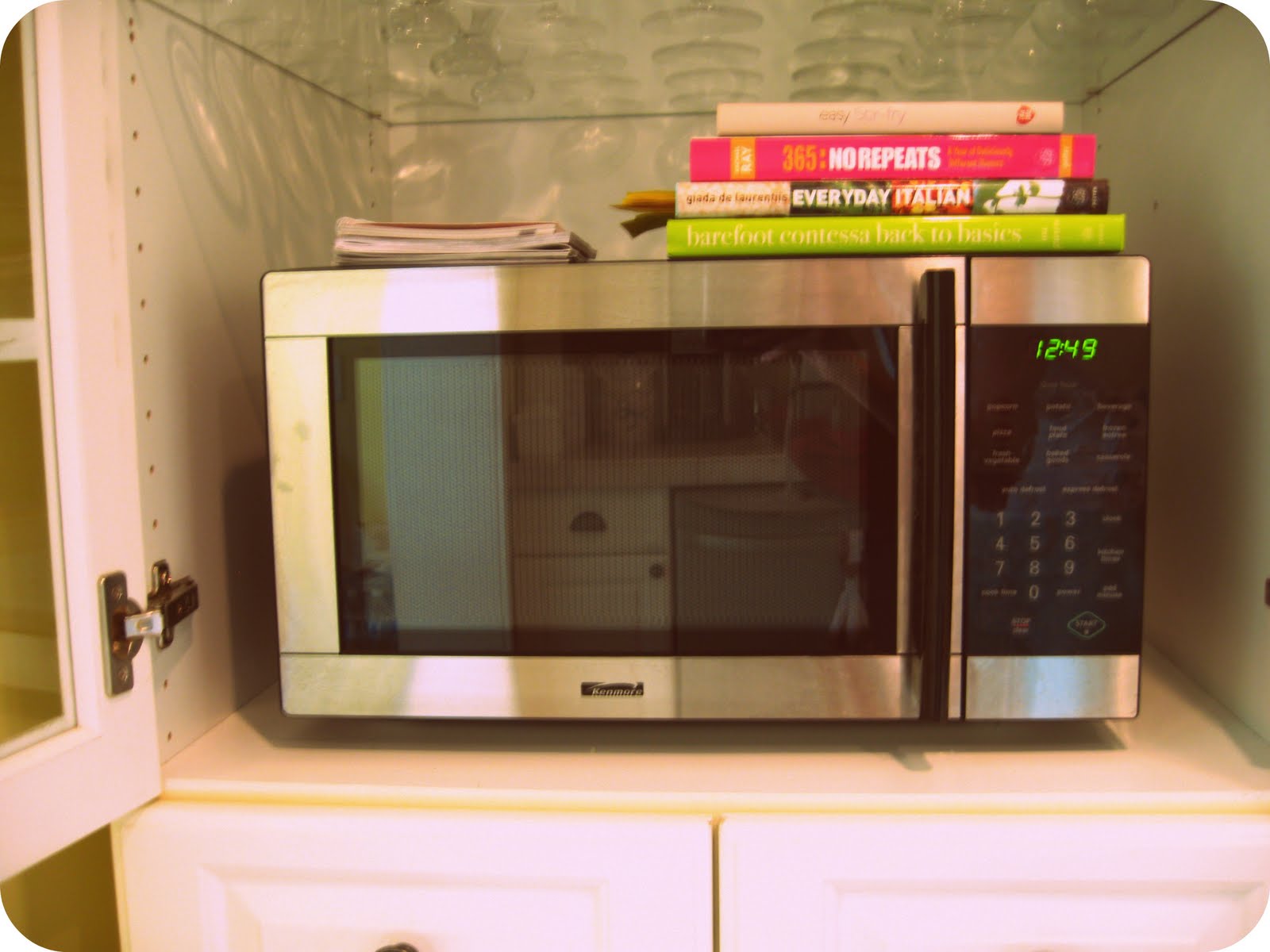 One of my most favorite parts of the cabinets is that we can put our microwave in there. It frees up so much needed counter space, which is great!We have it pulled far enough forward that there are no worries of it not being able to vent properly, it works out great!