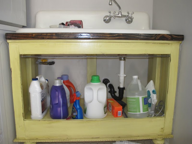 I love love love it! Its super simple, but yet fun at the same time. When I need to get the detergents or products out, I simply reach in or throw the flap up. I contemplated making the curtain a two panel curtain, but then I was afraid I would always leave one side open a little too much and constantly be looking at all thats inside. And for those of your who have been asking about the faucet, here is a closeup. We got it {here} on eBay.