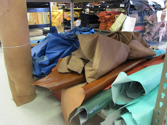 Here is the table of all of the upholstery hides {minus the table that had the more expensive ones, we didn’t even want to look at those for fear of temptation!}: