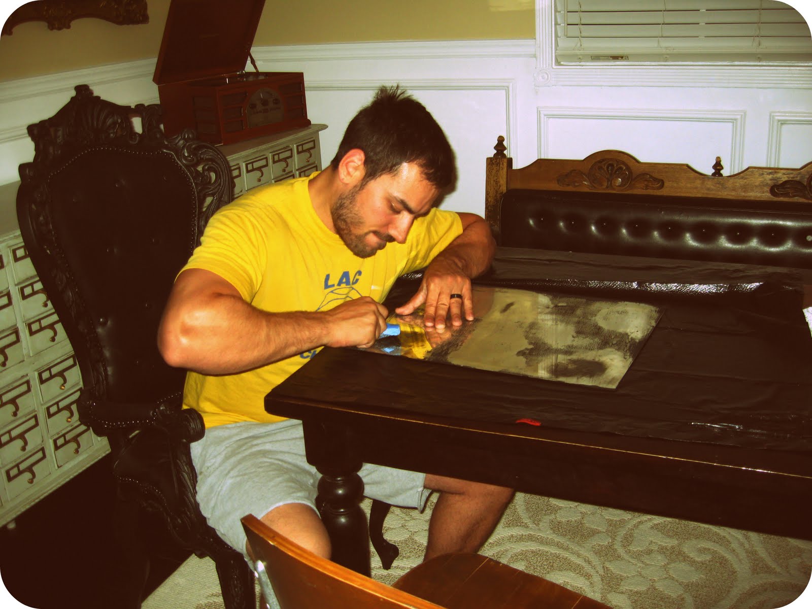 A project that we thought would take an hour maxxxxx…well, all in all, was no fun. The tutorial said that you could spray the Easy Off on, leave it for around 5 minutes, and the silvering from the mirror should come right off. Haha. I have to admit, the post did say that some mirrors are more stubborn than others, but holy crap. We sprayed the first set of “holes” and 5 min. later wiped it off to see no change. We did it again and left it for 30 min. No change. Did it again, left it for about an hour, barely any silvering coming off. The last two times we did it, we left it for about 3-4 hours each, and we scrubbed with all our might in between {haha I should say J, because,lets be honest, I would scrub for about 2 min. and be tired- hard work people, hard work}