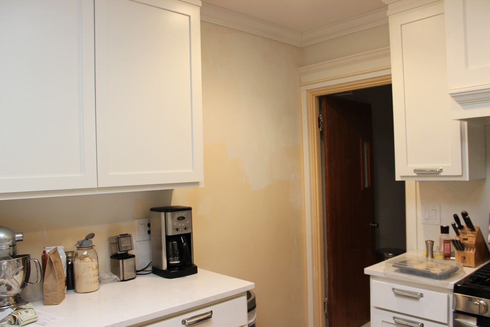 So, do we carry the tile above the door frame and do that whole wall {and area behind the coffee maker}? Or do we keep it just to behind the stove. I am leaning towards doing it all, J is less. He thinks it could be weird having that whole wall in tile, attracting your eyes there, when theres nothing there to look at. I think it will look super clean and bright, and I would love to have some backsplash behind that counter, so I want to continue it.