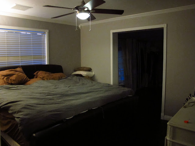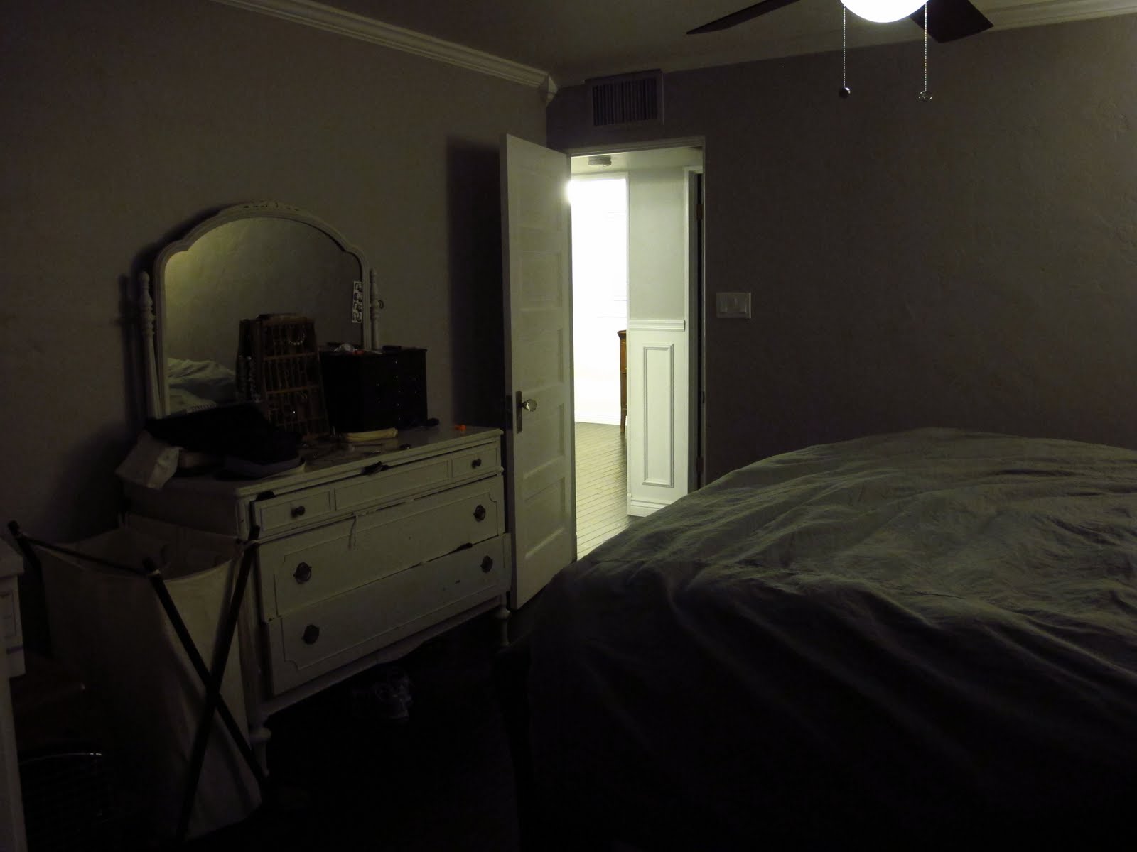 Yep, there she is in all her beauty sickness. Yes, I could have taken shots during the day, or maybe even with a flash, but that wouldn’t show the truth. The truth about this room is that the lighting is beyond terrible. To the point where if I want to read a book in there at night, I literally would have to use a flash light. No freaking joke friends. Yes, we have been living this way for almost two years, and I have no idea how.