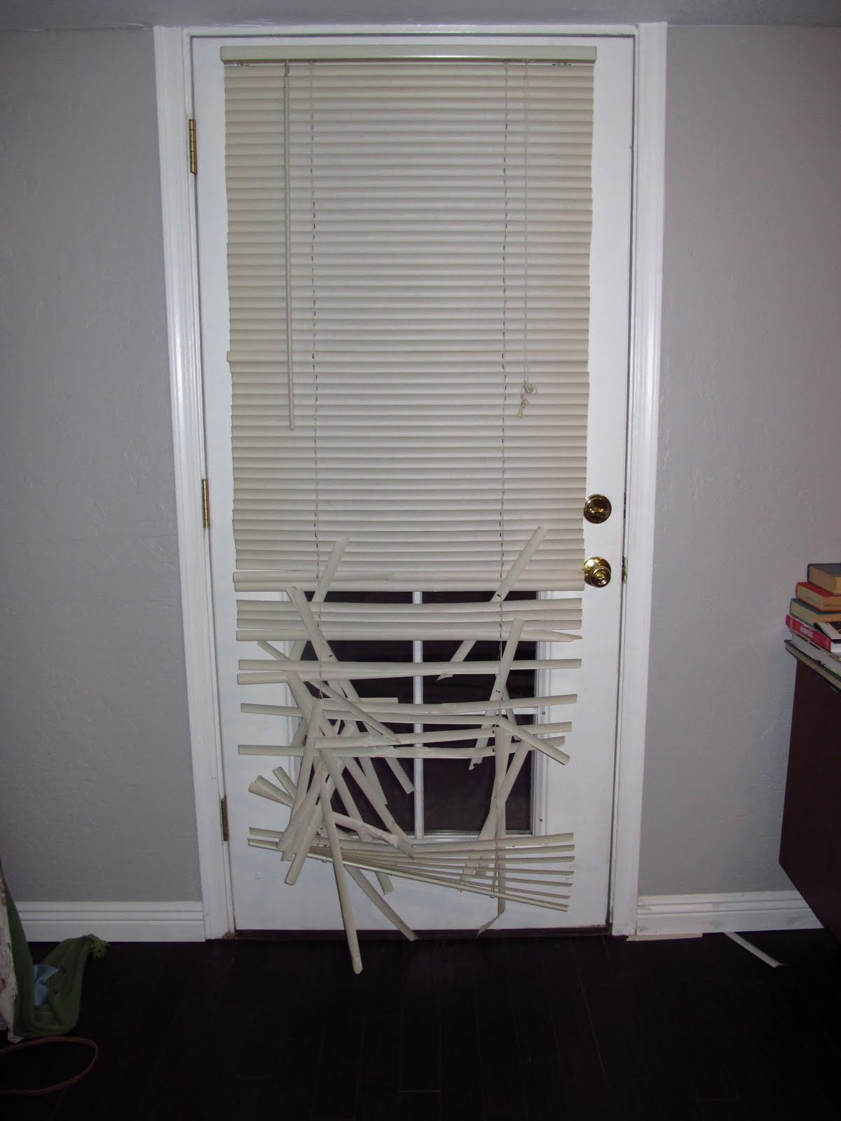 That is the door that leads to the backyard from our room. It is also the door that Honey still as a puppy would look out of all the time. You see, whenever she would think she heard something outside, she would run up to this door and claw her way through the crappy blinds so she could see outside. I am pretty sure there hasn’t been one time ever that we had a friend over, they see this, and don’t say something along the lines of “TAKE THOSE DOWN NOW..THEY ARE EMBARRASSING”. That they are people, that they are!